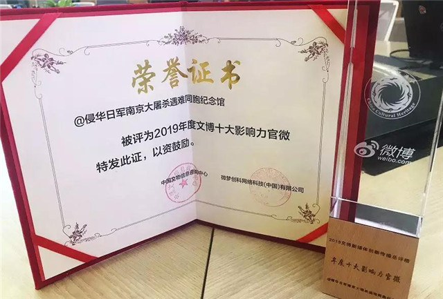 本次论坛上,主办方颁发了2019年度文博十大影响力官微、2019年度文博十大创新力微博等奖项。纪念馆官方微博“@侵华日军南京大屠杀遇难同胞纪念馆”获评2019年度文博十大影响力官微,这是我馆第3次获此殊荣,成为获得该奖项的唯一一家纪念馆。