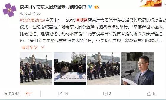 清明节,由我馆出品发布的《2019清明祭》视频刷爆网络,3天阅读量达到8297万,视频被学习强国、人民网、新华网首页推荐。国家公祭日前夕,由我馆主办的“感恩·南京安全区”第四届国际和平徒步活动完美收官,活动图文报道被学习强国、新华网、交汇点等国内重量级央媒、网络媒体转发……