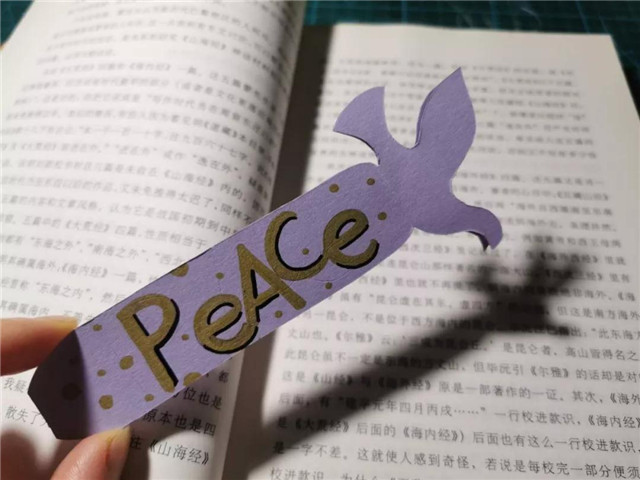 英语单词Peace,是和平、宁静、和谐、融洽的意思。做一枚和平鸽小书签,等到开学时插进新书里,祈愿我们生活的地球村永远和平安宁!
