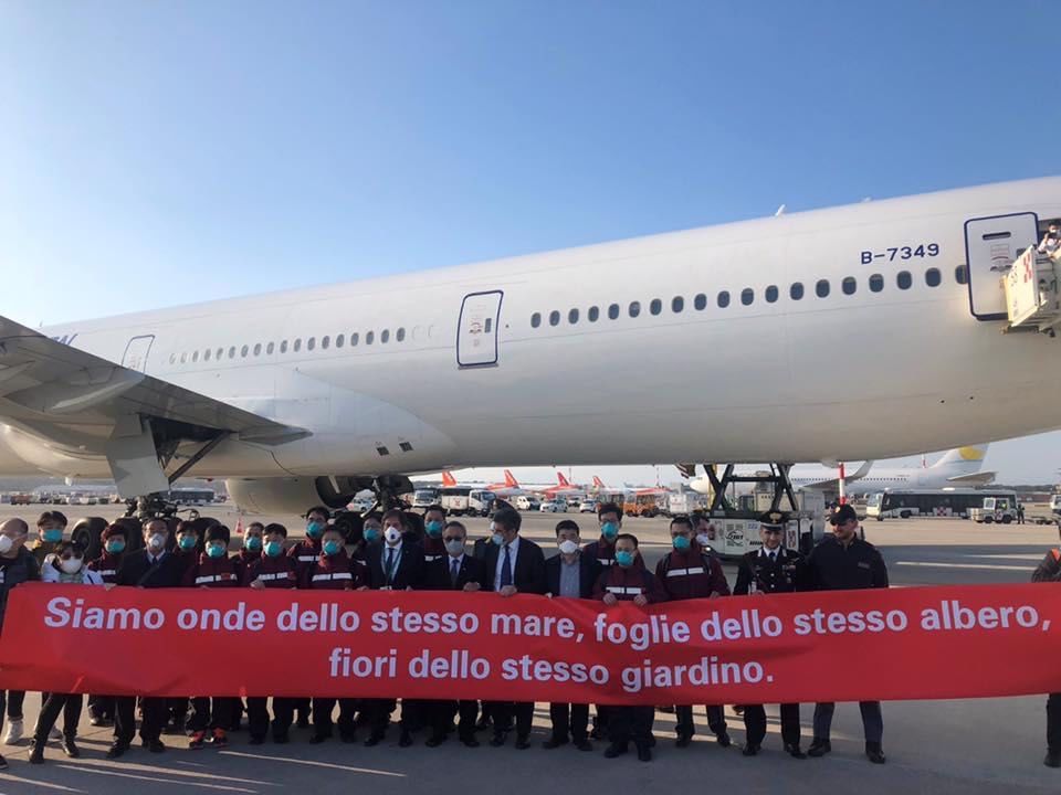 由300名中国重症监护医生组成的抗疫医疗专家,带着成吨的医疗用品抵达意大利。横幅上写着:“我们来自同一片大海的波浪,来自同一棵树的叶子,来自同一个花园的花朵。”谢谢中国。