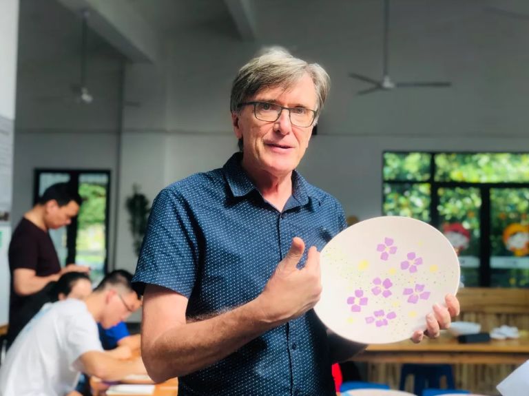 在夏令营活动中,克里斯·马吉绘制了象征和平的紫金草图案