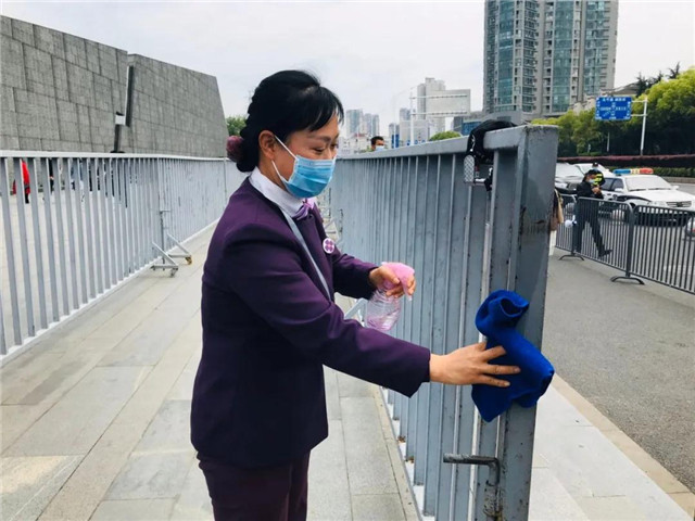 纪念馆客服人员每隔15分钟,就对预检口围栏等观众频繁触碰的区域进行消毒。保洁员每天巡馆消毒至少7次。展区内,围栏、楼梯把手、电梯扶手等观众接触较多的地方都是重点消毒的地方。