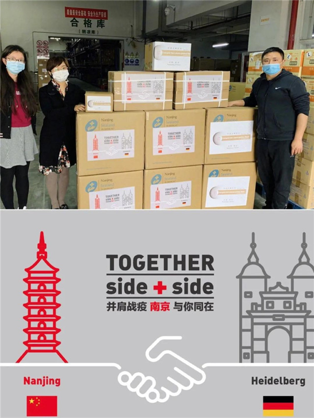 南京得此消息后,纪念馆等紧急行动,爱心企业迅速采购。620瓶指定药品、200套防护服、30000只口罩等筹措到位。除向拉贝后人捐赠外,南京还向海德堡市政府、海德堡医学院捐赠医疗物资,帮助他们渡过难关。北京时间4月17日17时33分,这批物资从南京飞抵德国,目的地是海德堡。物资包装纸箱上所贴图标是中德两国国旗,上方南京大报恩寺琉璃塔和海德堡古桥并肩而立,两只大手紧紧相握,“并肩战役,南京与你同在”。