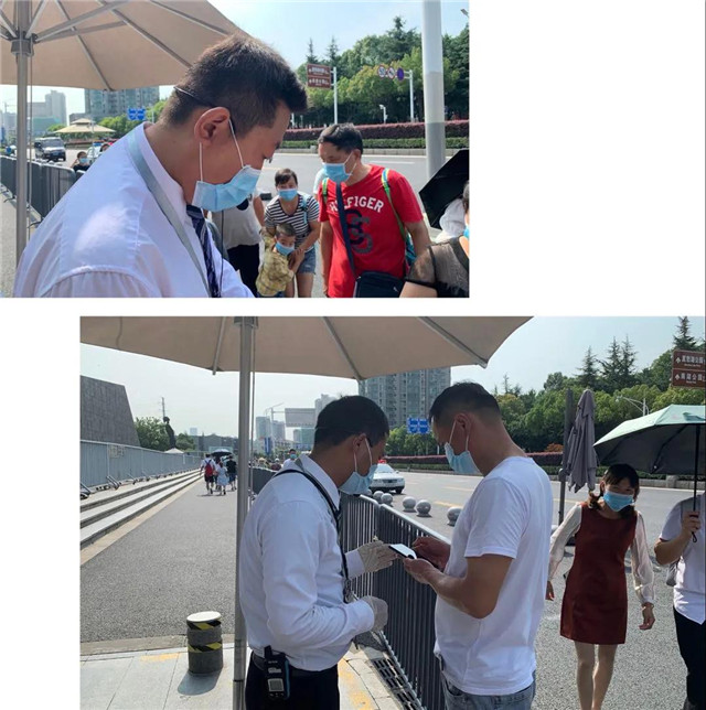 纪念馆每天有馆员、安保、物业等200余人在岗。预检岗,是纪念馆把控安全的最前沿。这里每天有3名助览员轮流上岗值守。这些天,他们每人皮肤都黝黑了好几度,每天下班,身上的白衬衫都有盐霜。孙殿清是其中之一。自今年恢复开馆以来,除每周一例行闭馆外,他每个开馆日都在岗。每天8点前就到岗,做好准备工作,迎接一天中的第一批预约观众。