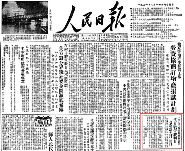 1951年8月13日,政务院发布通告,将抗战胜利纪念日改定为9月3日。通告指出:本院在1949年12月23日所公布的统一全国年节和纪念日放假办法中,曾以8月15日为抗日战争胜利日。查日本实行投降,系在1945年9月2日日本政府签字于投降条约以后。故抗日战争胜利纪念日应改定为9月3日。