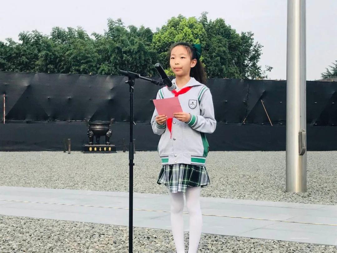 南师附中新城小学怡康街分校五(1)班学生黄忆茜作为南京市少先队员代表发言,主题是:《勿忘国耻 振兴中华》。黄忆茜说:“站在国旗下,我们为祖国的腾飞而骄傲自豪,同时也意识到自己肩上的重任。天下兴亡,匹夫有责!我们要牢记历史教训,树立国防意识,以振兴中华为己任,为中华崛起而读书!”