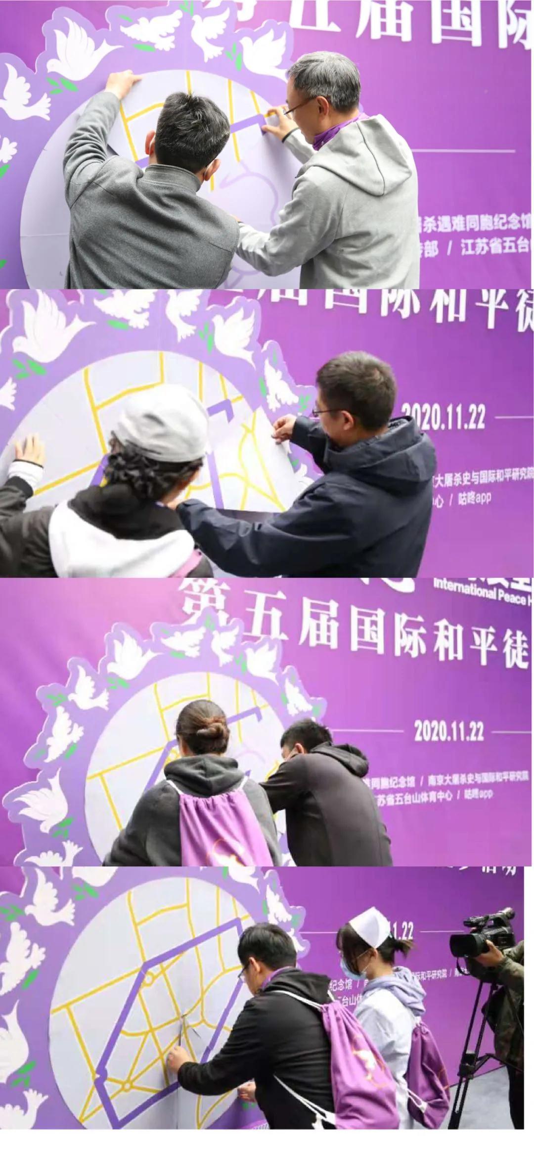 在徒步活动启动仪式上,张建军馆长、鼓楼医院纪委书记岳飙;南京市红十字会党组成员秘书长李俭、鼓楼区委宣传部副部长桂峰;凌曦副馆长、鼓楼医院援鄂医疗队代表周路阳;时鹏程副馆长、南京护理职业学校学生代表吴可静两两一组,先后手持拼图卡片,共同拼成“南京安全区”感恩拼图。