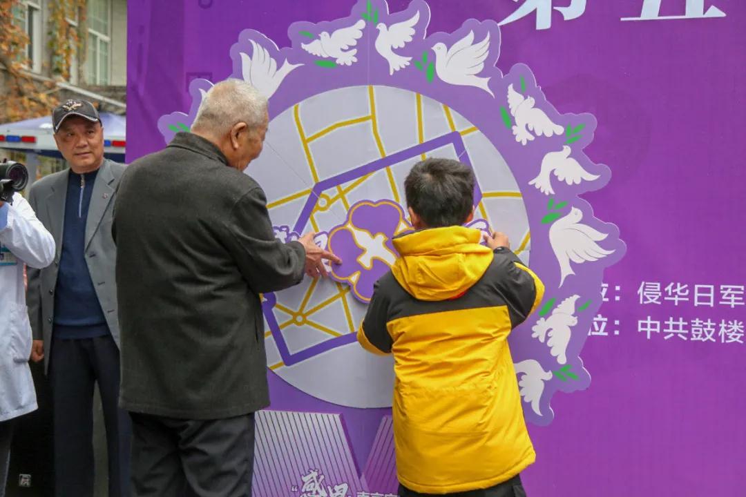 南京大屠杀幸存者葛道荣老人和南京市小学生代表邓言在拼图墙上粘贴象征和平的紫金草。