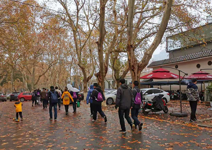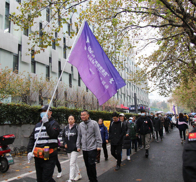 上午9时,徒步活动开始。83人分成两个方阵,冒着细雨徒步当年南京安全区,用脚步丈量国际友人的大爱之路。
