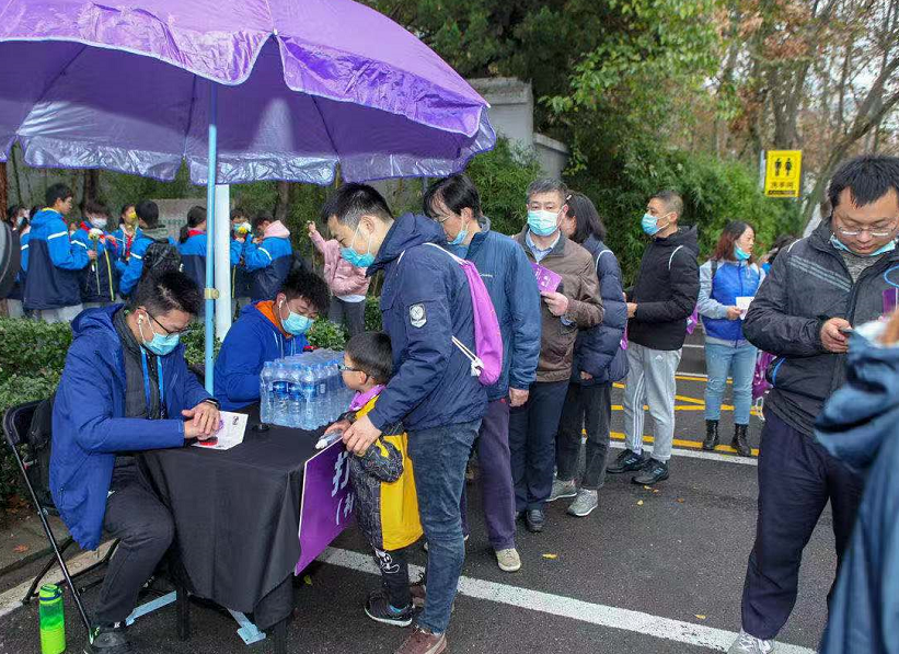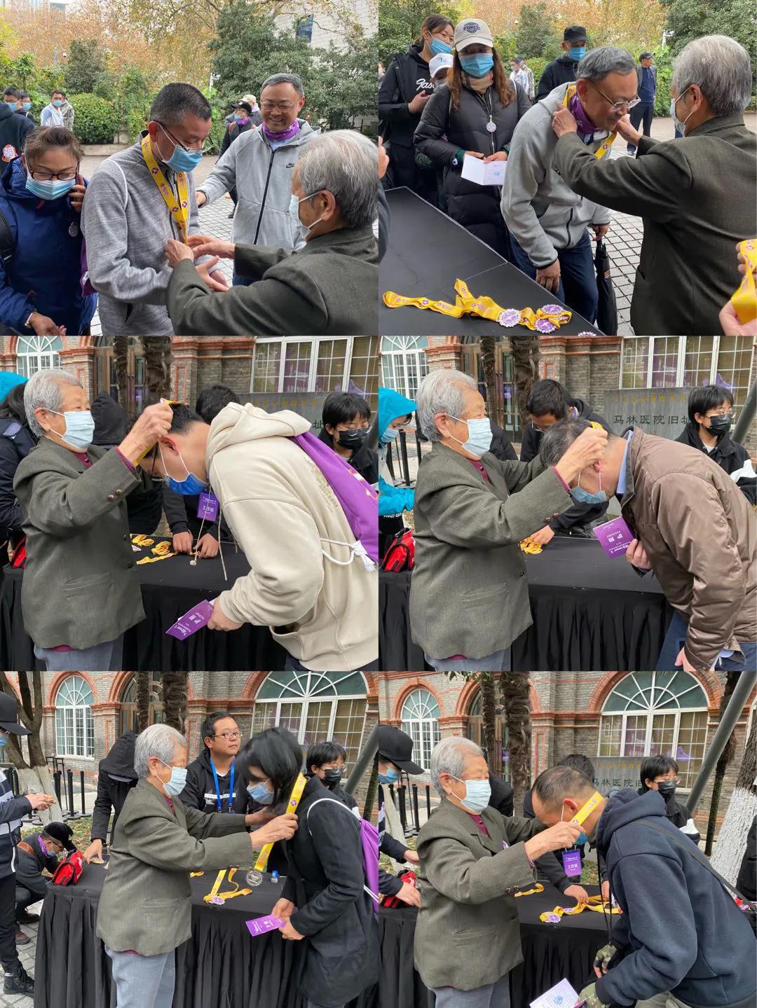 10:50,第一批徒步者抵达终点——鼓楼医院。寒风中,南京大屠杀幸存者艾义英为每一位到达终点的徒步者颁发和平纪念牌。