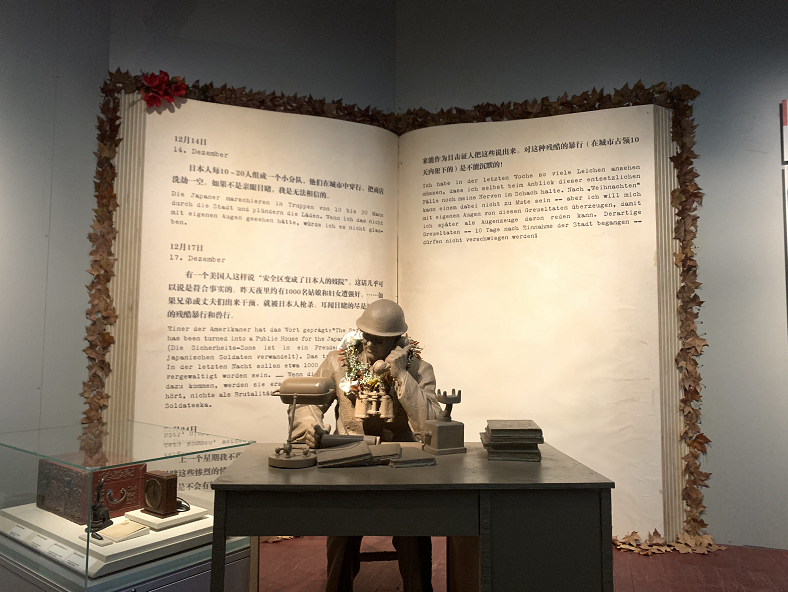 值得一提的是,南京安全区国际委员会成立的次日,是南京安全区国际委员会主席约翰·拉贝的生日。今天,我们也在展厅中的拉贝雕像前举行“花语”主题展示活动,以鲜花和代表南京的金色梧桐叶装饰《拉贝日记》大屏幕,寓意《拉贝日记》对和平事业的贡献。