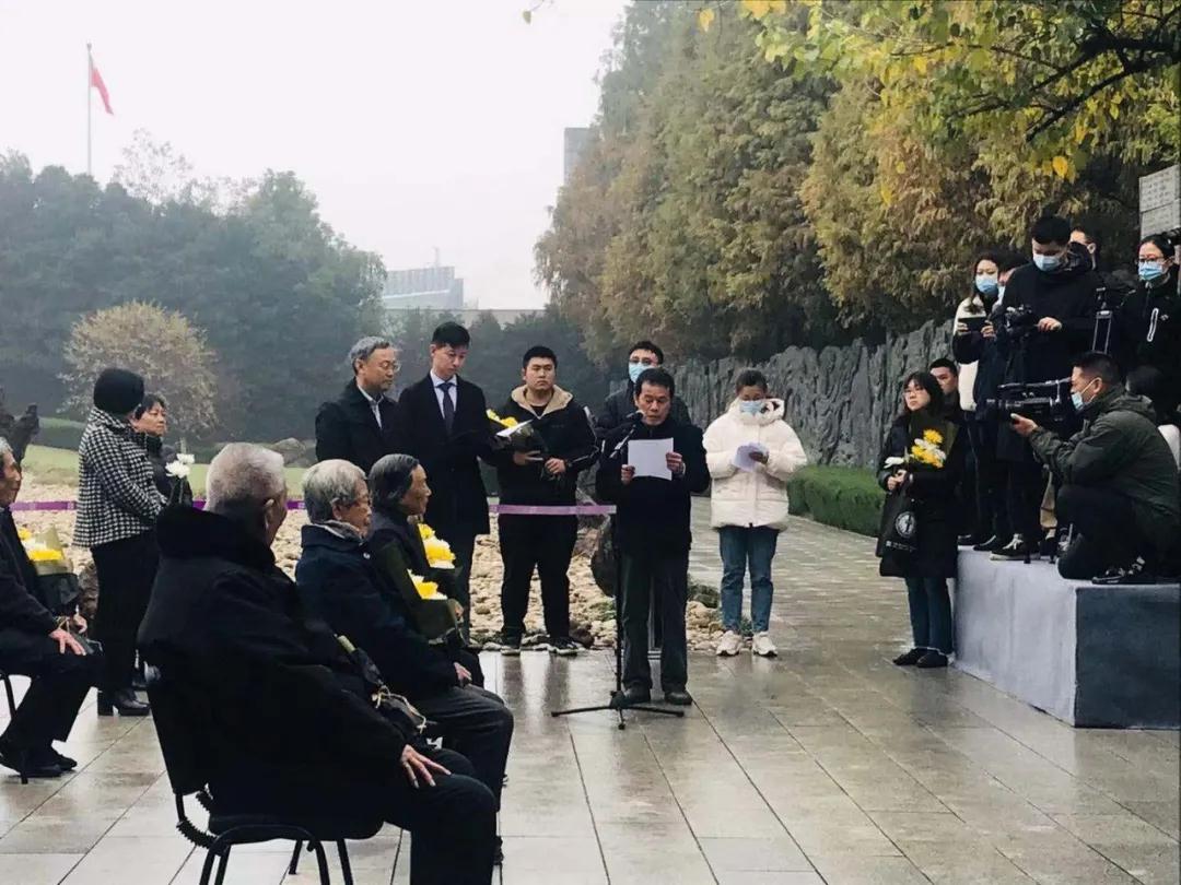 南京大屠杀幸存者艾义英之子黄兴华发言:“83年前的冬月,我母亲一家六口人在南京平家岗被日军残忍杀害,母亲每天躲到山上才勉强活下来。这是我的母亲亲身经历并经常向我们讲述的一段回忆。作为南京大屠杀幸存者后代,今年来参加家祭活动,就是要悼念在那场屠杀中逝去的亲人和同胞,就是要一代代传承祖辈受害的历史记忆,就是要唤起人们对和平的向往与坚守。不管时间过去多久,同胞们受难的痛楚一直印在我们每个人的心中;无论时代如何变迁,历史真相永远都在那里,警醒和启示着后人。”
