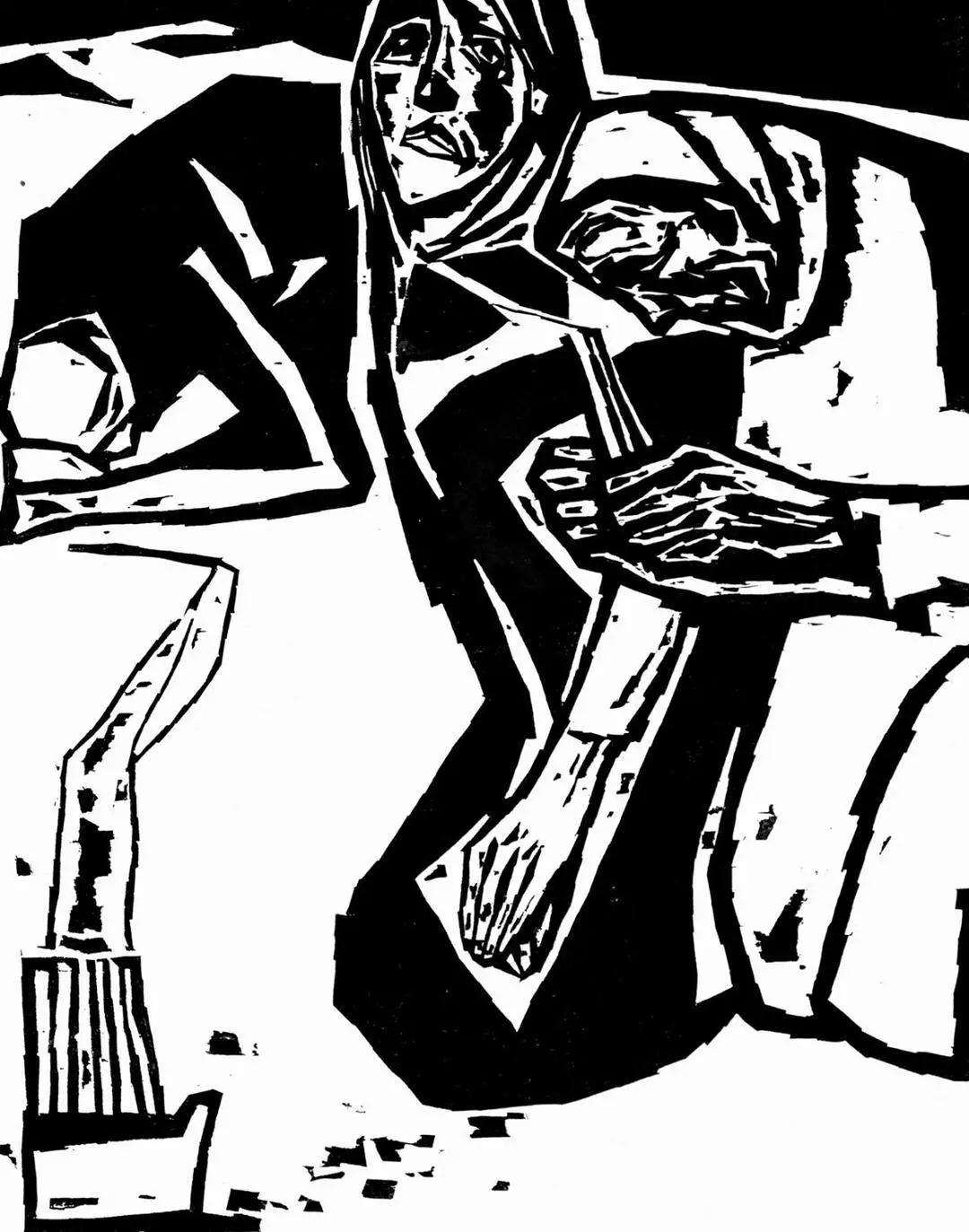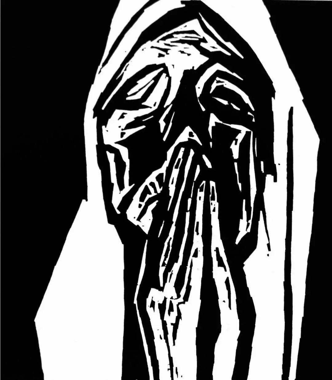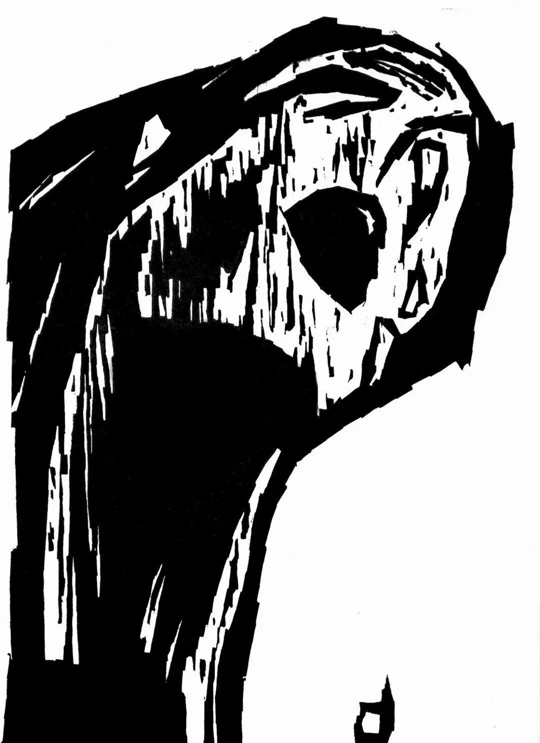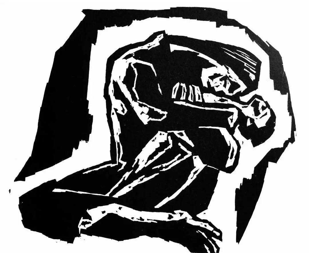 这幅大画,在完成构思和绘制草图后,光是上板刻,就刻了一年之久。由于是黑白版画,必须当天印完,从早晨一直印到晚上才得完工。它像宽银幕一样的巨大画面,拉开了悲剧的序幕,把人们引向血雨腥风的往昔。