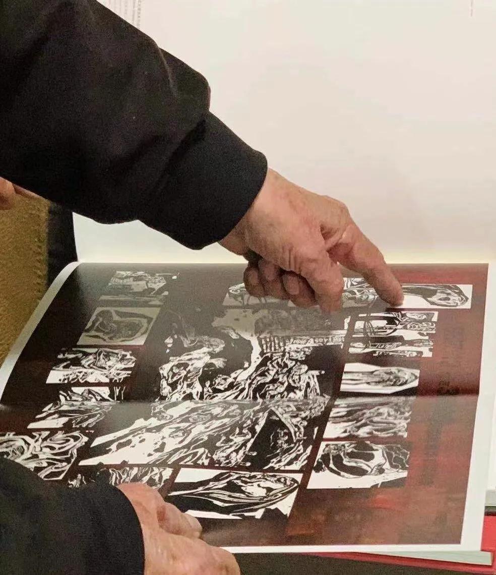 尽管已87岁高龄,但聊起“南京大屠杀”主题版画的创作经历,程勉先生依旧思绪敏捷,滔滔不绝。他说,创作的源起,在于1982年日本文部省修改教科书、篡改历史。“当时在我们国内激起了巨大的抗议声”,他随后查阅了1937年底日本侵略军在南京屠杀30万居民的文字、图像和纪实影片等资料,构思了许多草图,“脑海里涌现出无数的人,耳目所及,遍地是血、枪杀时的喊叫、母婴的哭泣、血染的秦淮水、成堆的尸体、火烧、活埋……”