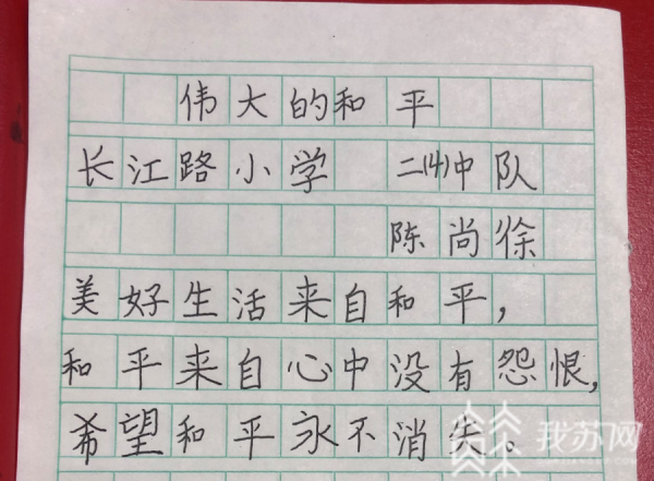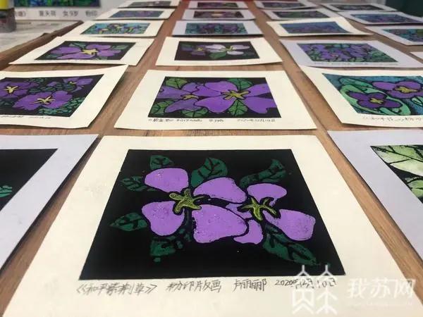 五(1)班张李宁用铅笔、吹塑纸、颜料等材料制作了一幅名为《和平》的粉印版画,“有和平鸽,还有橄榄叶以及和平花,还有小朋友手举着‘和平’两个大字,让我们珍爱和平。”