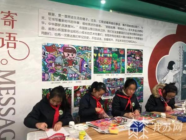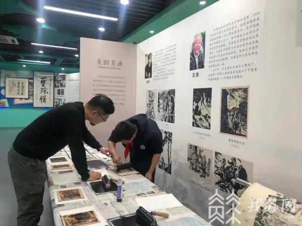 在三楼的版画博物馆,教科室主任肖思远老师带着学生进行版画创作。展板上展示着中国版画大师们的作品,比如有李桦的《怒吼吧!中国》,王琦的《跃马杀敌》,彦涵的《当敌人搜山的时候》等作品。“我们这边复制了一些30、40年代版画家们的作品,当时他们用黑白墨色反映主题大部分都比较沉重:有的是侵略者的罪行,有的反映人民生活非常困苦。战争烽火连天的主题和向往和平的主题对孩子也是非常好的爱国主义的教育。” 肖思远说。