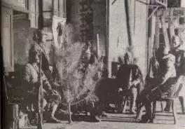 1937年底,几个日军士兵持枪聚集在南京玫瑰理发馆门前,环绕着简陋的圣诞树作乐