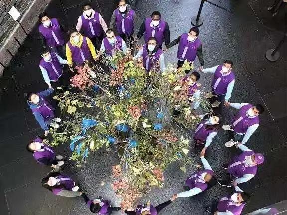 9月21日国际和平日:此次“花语”主题装置以象征和平的绿色为主色调,以白色、蓝色、紫色花为主体创作,整个作品以花植拼组成五线谱状。5只和平鸽穿插其间,好似五线谱上跳动着的和平音符,也象征着世界五大洲的和平之音。