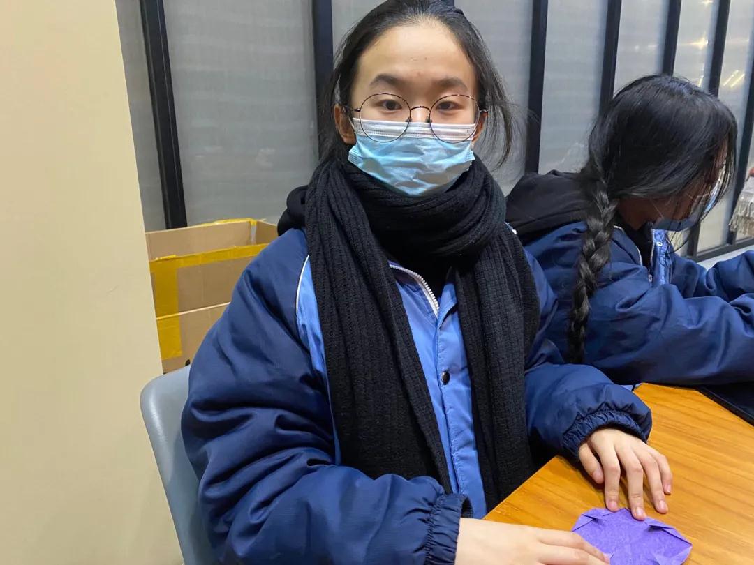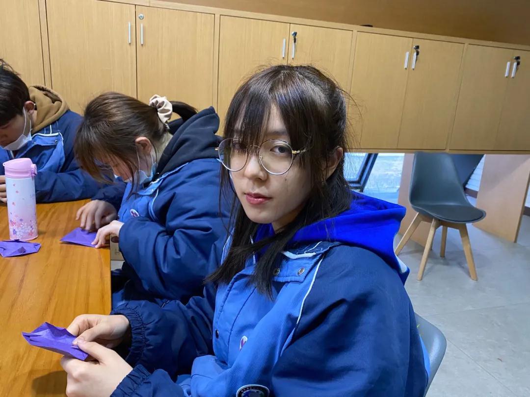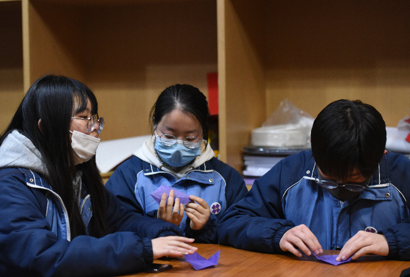 中午,他们动手制作和平之花紫金草。紫色的方片纸在手中翻转,一朵朵象征和平的紫金草花朵跃然而出。