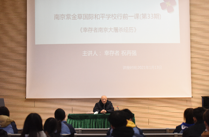 下午,师生代表倾听幸存者祝再强老人讲述自己在南京大屠杀期间的不幸遭遇。老人说:“我们要记住历史,珍惜和平。”