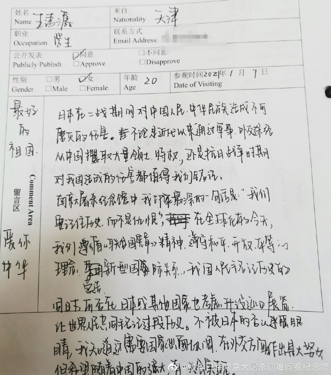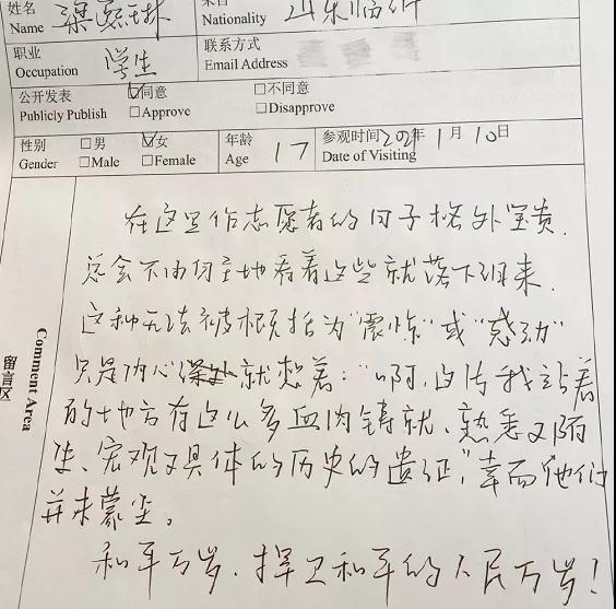 20岁的王同学写下了满满一页留言,字里行间都是拳拳爱国之情。她期盼着我们能走出国门举办展览,让世界人民都知道这段历史。