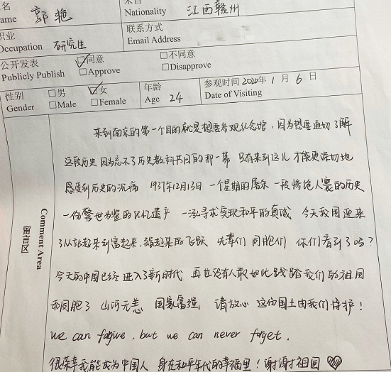 来自江西的研究生写道:“来到南京第一个目的地就是参观纪念馆,因为想迫切了解这段历史,因为忘不了历史教科书的那一幕,只有来到这儿才能更深切地感受到历史的沉痛……”