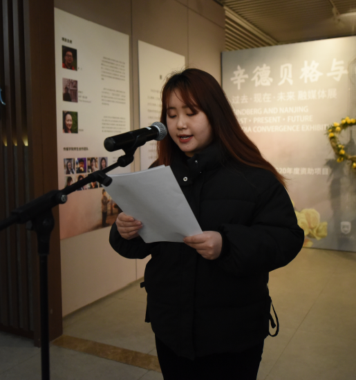江苏第二师范学院学生代表 张逸:“我们收集并阅读了大量辛德贝格在南京救助难民的资料,在此基础上进行了以史实为基础的艺术创作。在创作过程中,我对南京大屠杀历史、国际友人的事迹、人道主义精神有了更深入的认识。”