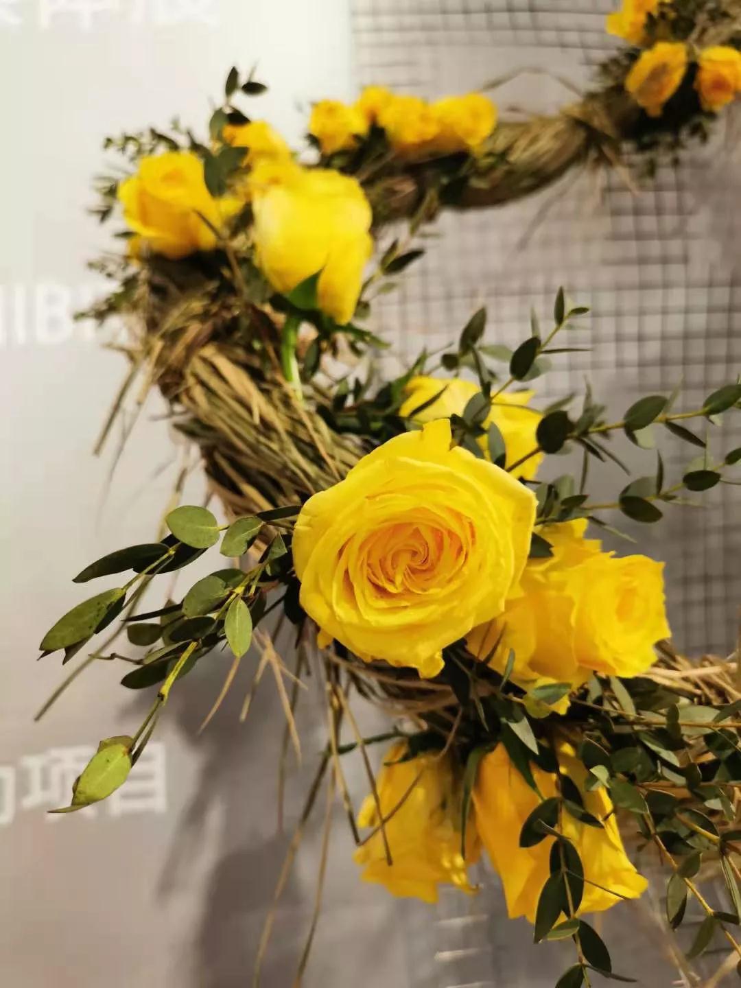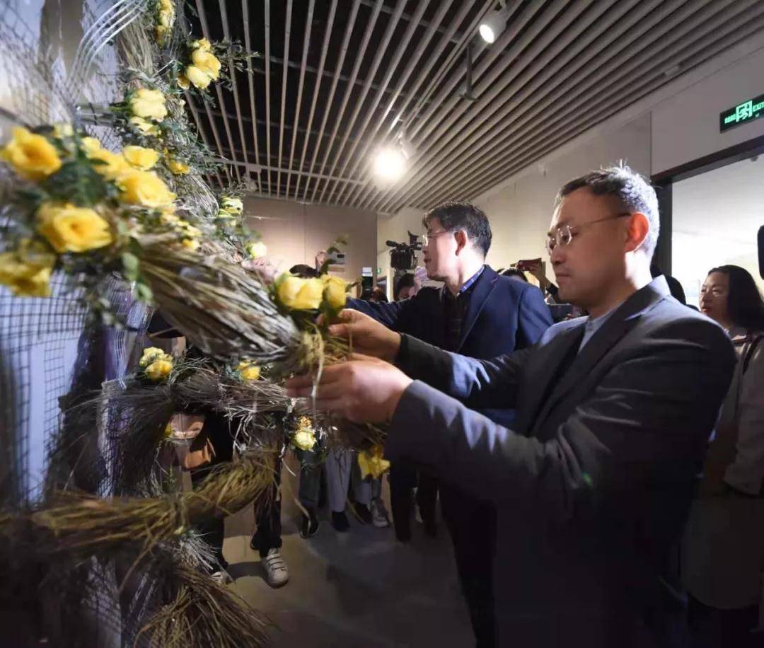 参加开幕式的嘉宾将黄玫瑰插入到花语作品