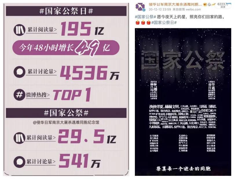 悼念去世幸存者的线上熄灯仪式,过亿播放量的“清明祭”视频,阅读量可以把全国网民覆盖二十多次的#国家公祭日#话题,我们发出的缅怀之声感动了越来越多的网民。公祭前夜一句“愿今晚天上的星,照亮你们回家的路”6小时内就让全国七万网民“泪目”。