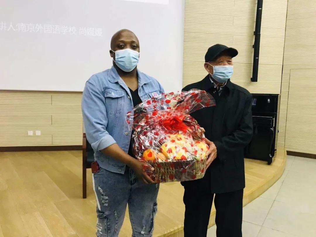 听完岑爷爷的讲述后,留学生代表向岑爷爷赠送了果篮,祝福爷爷健康长寿。