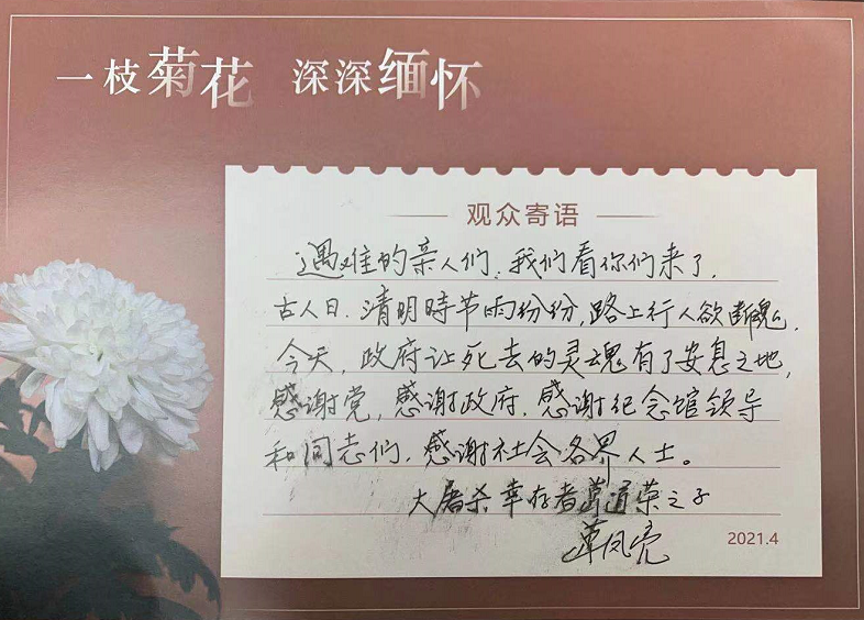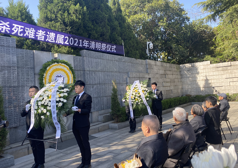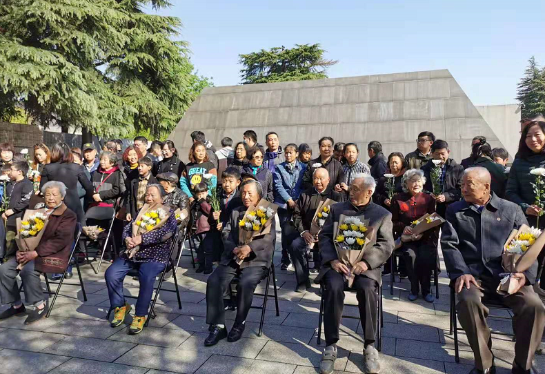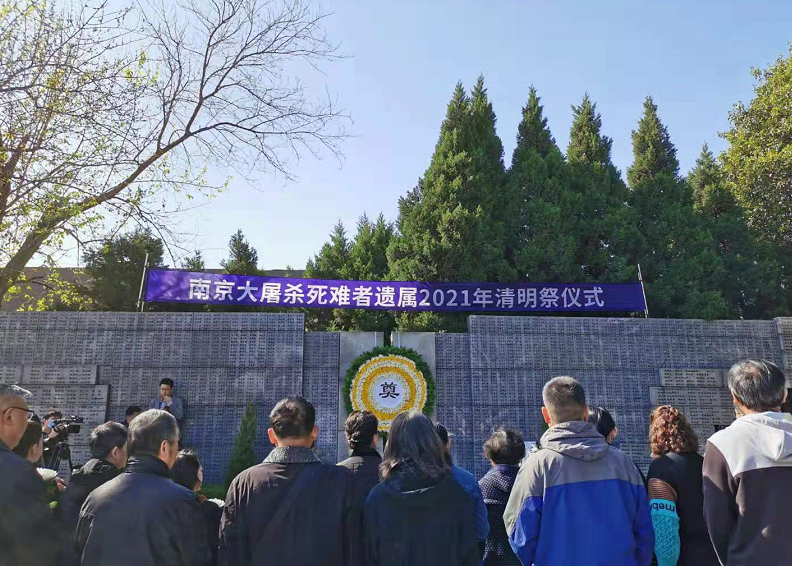 4月4日,清明节,上午9时,2021清明家祭活动在纪念馆遇难者名单墙前举行。幸存者葛道荣、夏淑琴、艾义英、马庭宝、石秀英、陈德寿、路洪才、刘民生、阮定东,去世幸存者佘子清、蔡丽华家属,死难者遗属代表来到现场祭奠亲人。