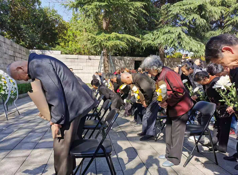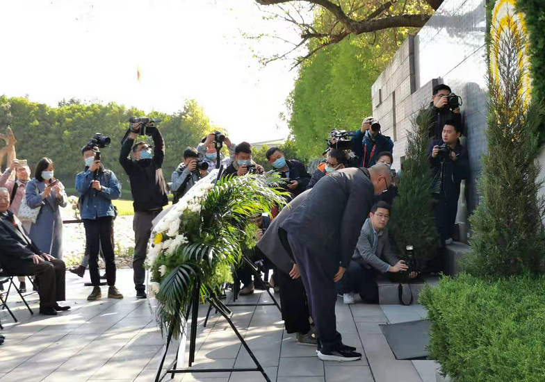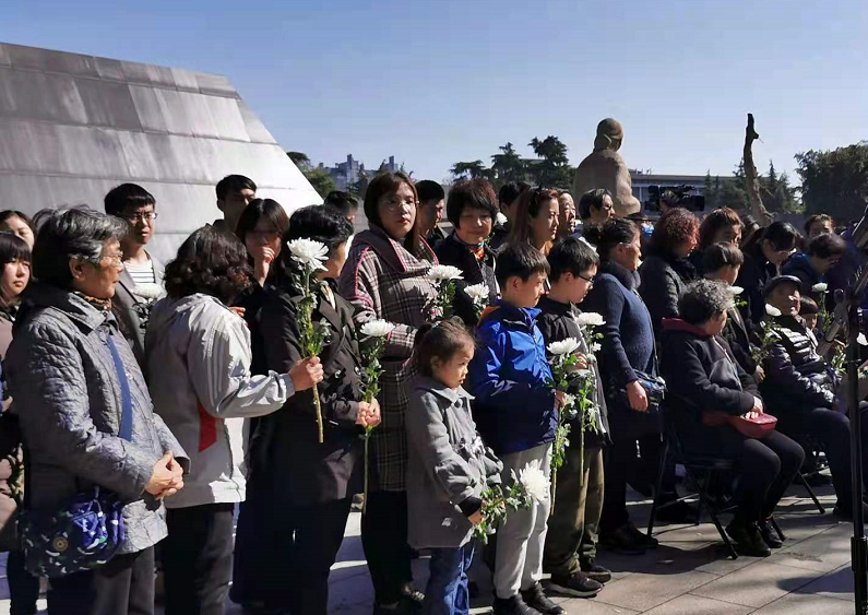 全体人员手持菊花向南京大屠杀死难者三鞠躬。