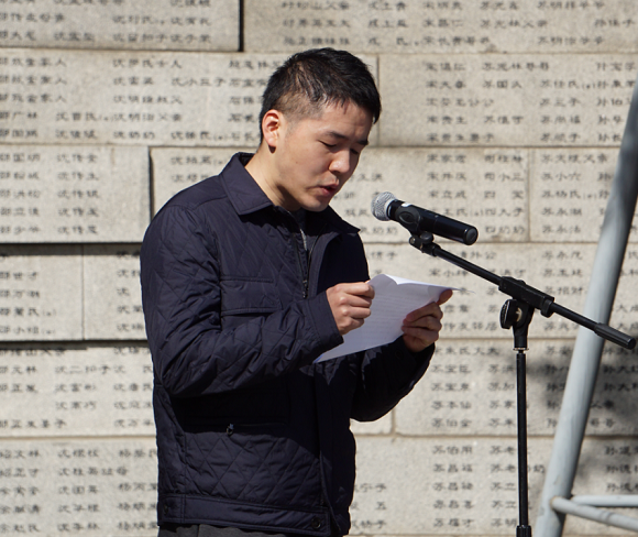 南京大屠杀死难者遗属代表黄睿发言:“我的奶奶是幸存者艾义英。当年,家中6位亲人被日军杀害,我奶奶从小就失去了完整的家。我们家当年的悲剧是南京大屠杀中无数家庭遭受苦难的缩影。我们不仅要悼念家中受害的祖辈,也要祭奠在这场浩劫中惨遭杀害的同胞们。”