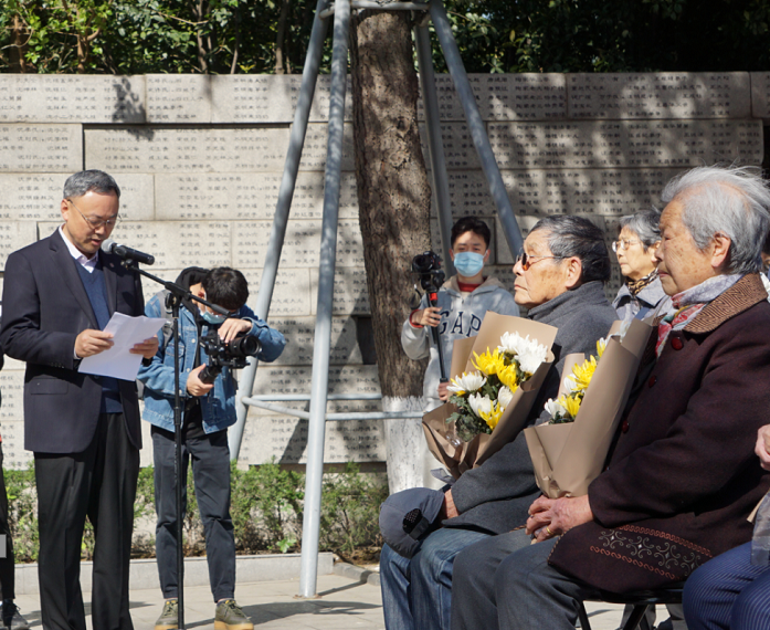 随后,张建军馆长发言:“每年此时,我们都要聚集在这里,共同缅怀南京大屠杀死难者。每年此刻,幸存者和家人都会到这里,给亲人献上鲜花。纪念馆作为历史记忆的重要载体和物理空间,我们与幸存者是一家人。在这一年里,我们和所有的幸存者家庭同舟共济,共克时艰,战胜疫情;我们通过邮寄防疫物资,表达纪念馆的关心;我们组织活动,让老人了解南京的飞速发展;我们会同共建单位,提供医疗服务,呵护老人健康……清明节的目的既是寄托思念,怀念同胞,更是激励国人发奋图强,建设更加美好的今天。”