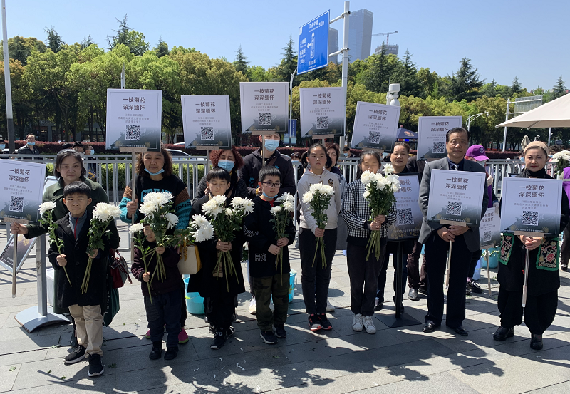 家祭活动尾声,幸存者及遗属代表依次向遇难亲人敬献菊花,其他参加人员依次向遇难同胞敬献菊花。