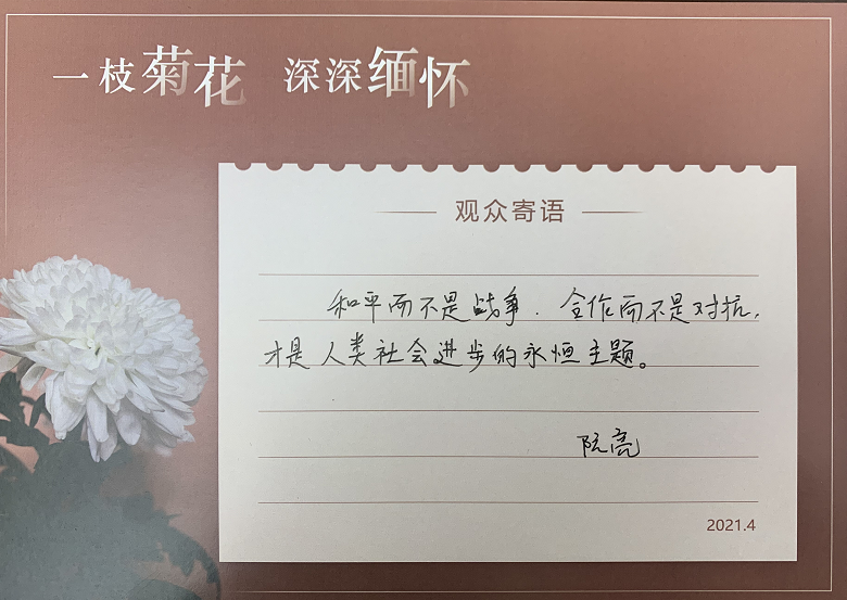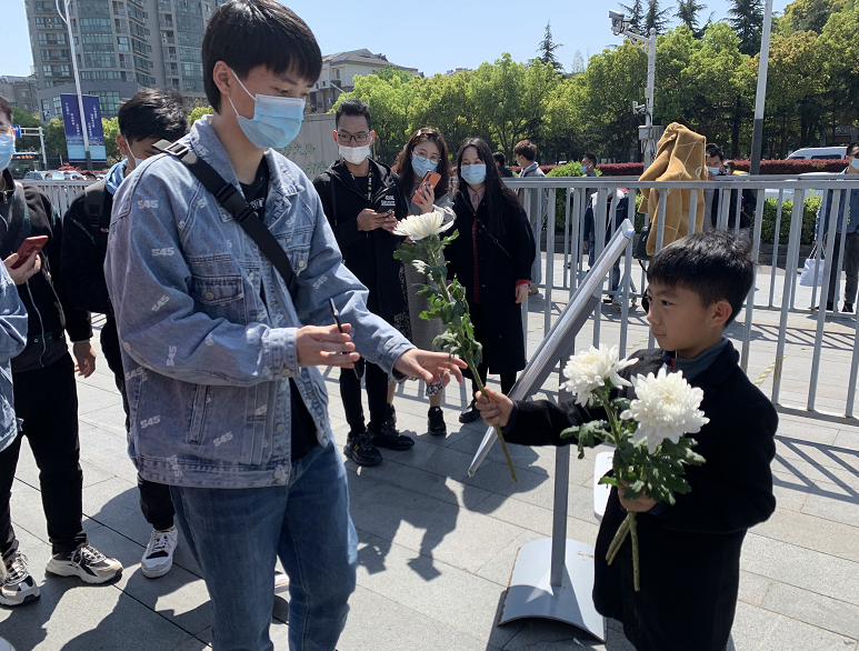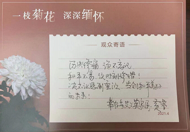 清明一早,纪念馆迎来了如织人流。南京大屠杀幸存者援助协会准备了1213朵白菊花,向扫码捐款的观众发放菊花。同时,准备了1213张“一枝菊花、 深深缅怀”的观众寄语签名卡,请观众写下参观寄语。