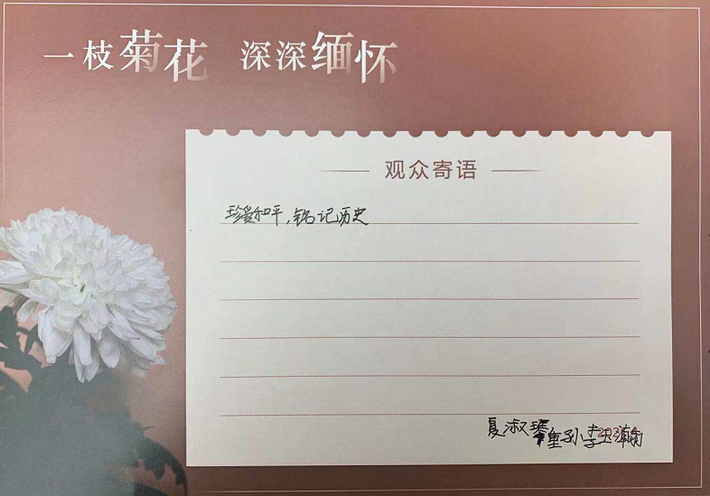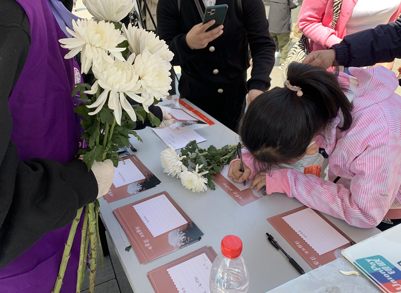 南京大屠杀幸存者艺术肖像摄影展开幕式活动结束后,幸存者后代代表及纪念馆工作人员代表来到我馆1号门处,引导观众捐款献花。用1213朵菊花、1213张留言寄语,缅怀逝去的同胞,祈愿永远的和平。