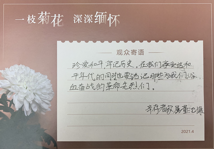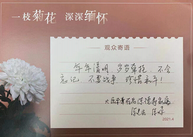 3月1日,蔡丽华老人去世。今天,她的10多位后代来到纪念馆参加家祭活动。她的儿子丁伟说:“几乎每年清明我们都会前来参加家祭。今天,我们全家四代一起来到纪念馆,其中还有3位小朋友,目的就是让这段历史代代传递下去。”