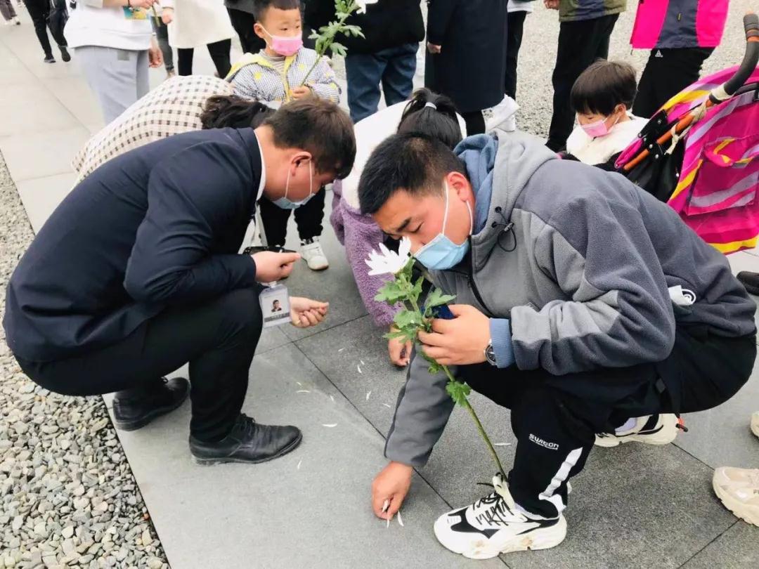 河南的马先生带着年幼的孩子来纪念馆参观。2岁女儿不小心把菊花瓣散落一地。随行家长和我馆助览员赶紧蹲下来把花瓣一一捡起。马先生说,纪念馆是庄重肃穆之地。菊花是用来缅怀死难同胞和抗战英烈的,具有特殊意义。