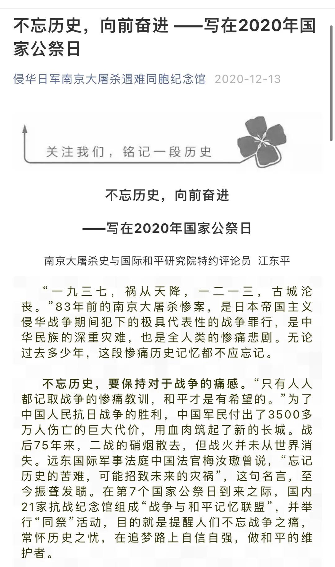 在重要纪念日和事件节点发布评论文章,引导社会舆论。2020年国家公祭日评论《不忘历史、向前奋进》,全网阅读量超过81万人次。2021年清明祭时评《家国清明忆同胞》,在“学习强国”平台强国时评栏目发表,阅读量达10万+。