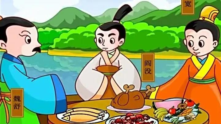 一日退朝后,魏舒招呼大臣阎没和叔宽一起吃饭。阎没和叔宽眼盯着饭菜,不停叹气。魏舒询问,俩人答道:"刚才肚子饿,担心饭不够吃才叹息。现在看饭菜很丰盛,又抚心自咎,魏将军家怎么会食而不足呢?不由得又自悔自叹。"并接着说,"现在酒足饭饱了,觉得君子的心也和小人的肚子一样容易满足就行了,应该把小人之腹的感受告诉将军。我俩觉得饭够吃的,酒够喝的就可以了,再好的东西也不想要了。"