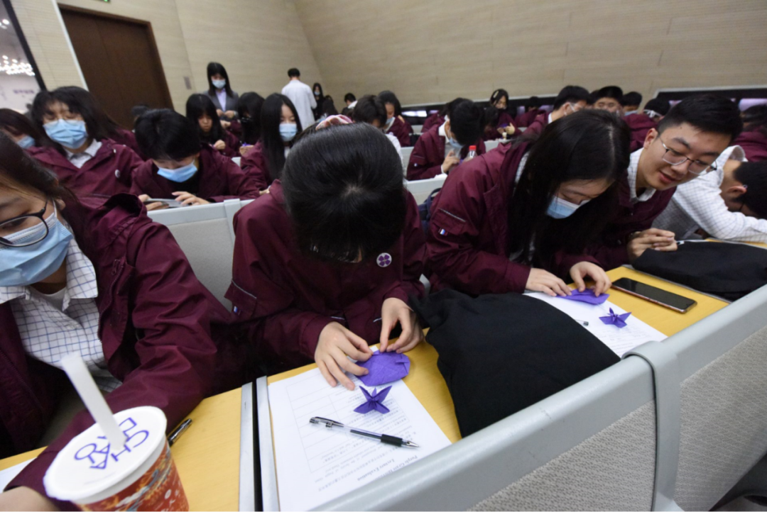 中午,同学们一起跟随我馆工作人员动手折叠和平之花紫金草,一叠、二折、三翻转......很快,一张张紫色纸片就变成了一朵朵象征和平与希望的紫金草。