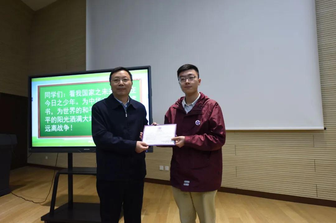 市教育局领导为“行前一课”学生颁发“和平使者”证书