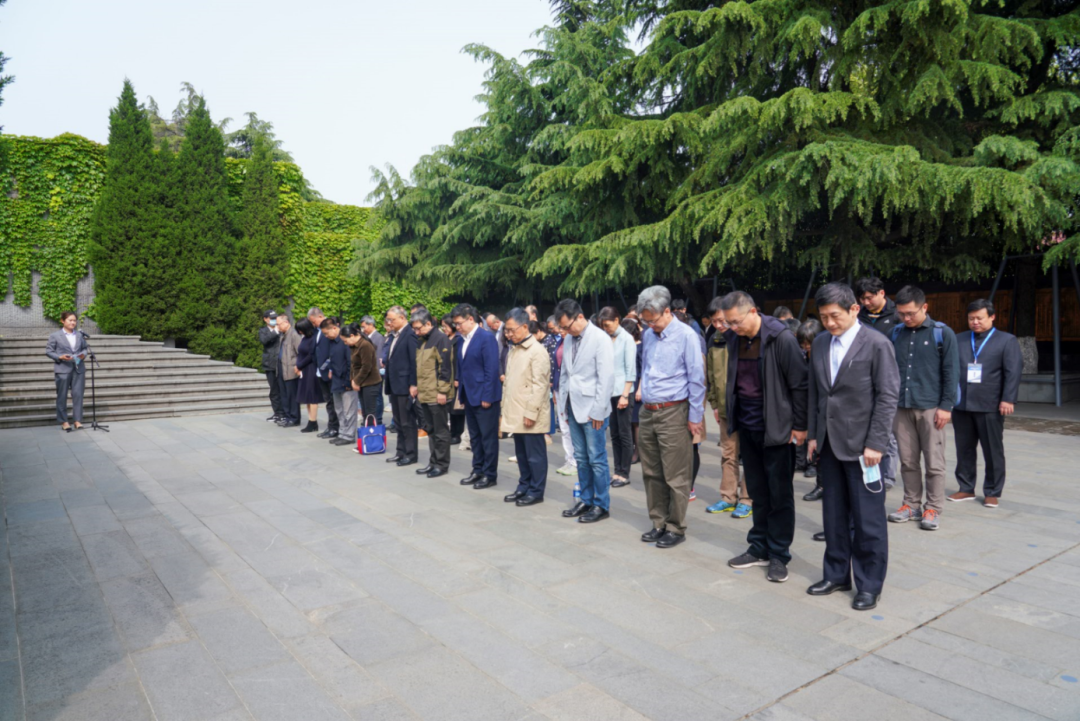上午九点整,与会专家们共同默哀,并向南京大屠杀死难者敬献花圈。
