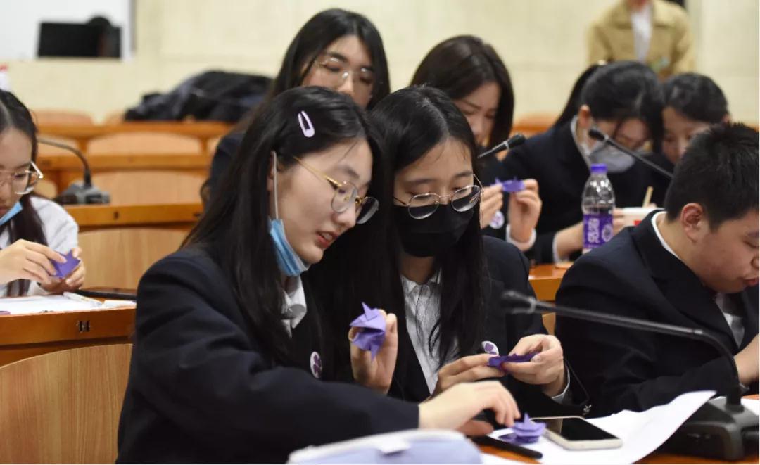 中午,同学们一起动手折叠和平之花紫金草。一叠、二折、三翻转......很快,一张张紫色纸片就变成了一朵朵象征和平与希望的紫金草。