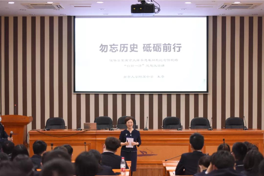 随后,同学们听南京大学附属中学党委书记朱苓授课,题目为《勿忘历史 砥砺前行》。朱苓书记告诉同学们:“同学们,不管你在哪里,你的心都是和你的父母、家人,和我们的祖国联系在一起的。在遇到困难的时候,总有一扇门为你打开,那就是我们伟大的祖国。”