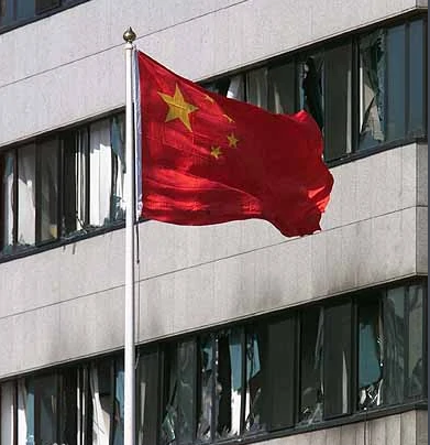 5月9日,中国驻南斯拉夫大使馆的国旗依旧在废墟上飘扬。
