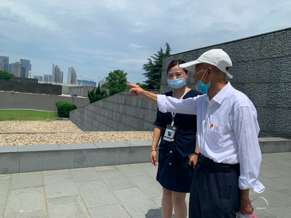 在我馆“光荣在党50年”纪念章颁发仪式结束后,陈平稳老同志提出要再到馆里看一看。他来到公祭广场,烈日高照,老人的额头上、鼻尖上都挂满了汗珠。望着广场上的公祭鼎、和平钟,望着广场上的一草一木,他不禁感慨道:“变了,但也都没变啊。”