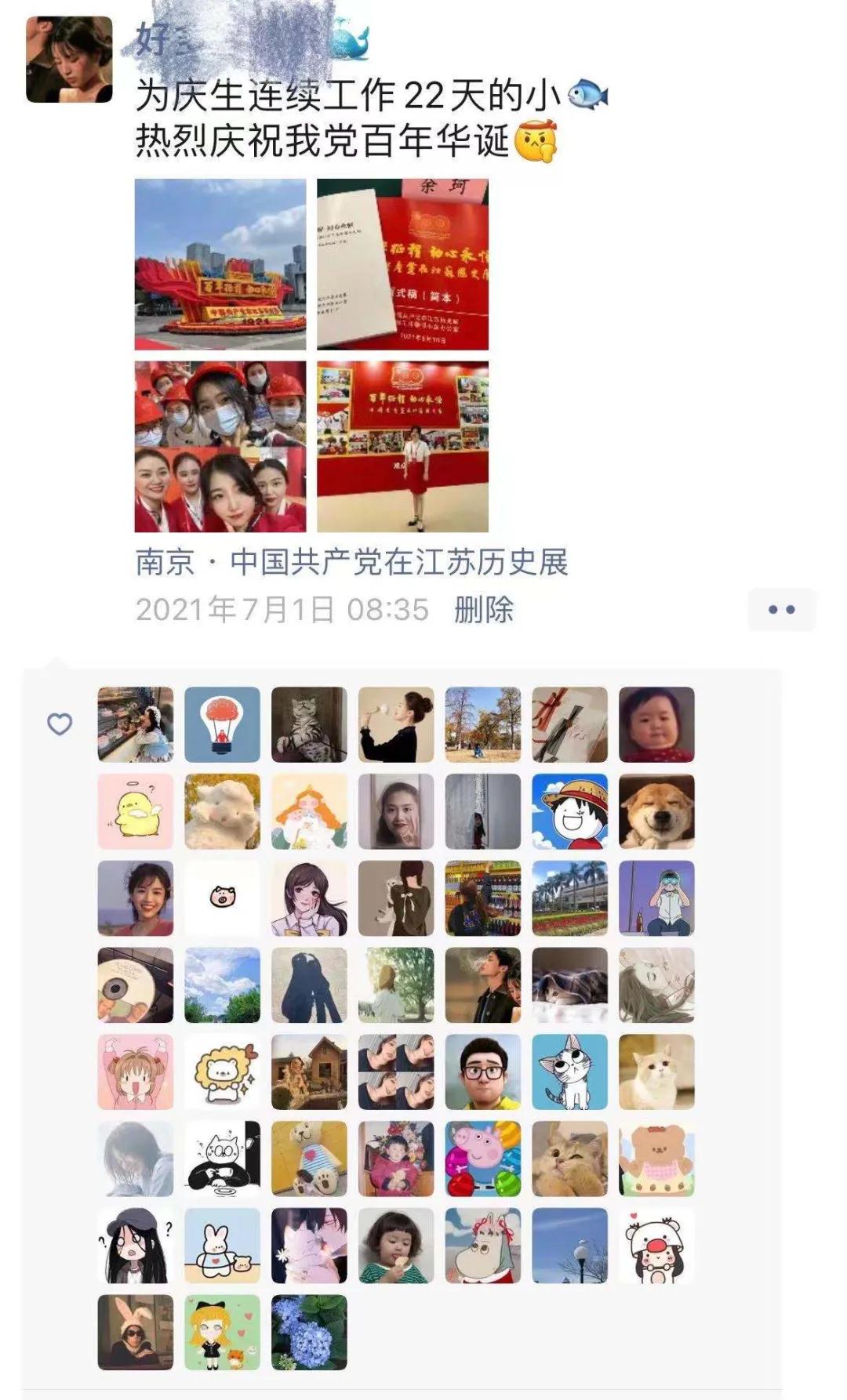 7月1日,中国共产党百年华诞当天,《百年征程 初心永恒——中国共产党在江苏历史展》正式对公众开放。余珂在展览现场为公众讲解。那天,她在朋友圈发了一条微信:“为庆生连续工作22天的小鱼,热烈庆祝我党百年华诞”,配图为自己穿着大红讲解服的现场工作照。妈妈看到后秒复制图片,并转发配文:“祝福伟大的祖国繁荣昌盛!”妈妈还给女儿留言:“为你骄傲”。