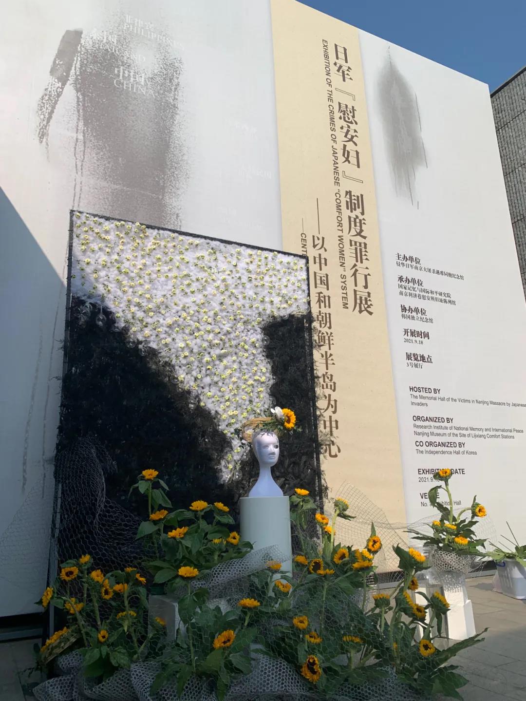铺满象征纯洁与希望的白色雏菊,下部分延伸至地面,铺满象征温暖与光明的黄色向日葵。用黄色向日葵和白色雏菊的意向表达,希望将温暖带给她们。与会嘉宾依次献上向日葵,缅怀在战争中受难的女性。